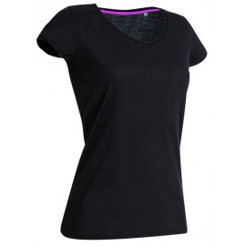 Dámské tričko s krátkým rukávem a výstřihem do V, boční švy. Módní žebrovaný průkrčník, kontrastní lem na vnitřní straně. Materiál: 100% přadená prstencová bavlna, 145 gsm. Doporučená technologie tisku: sítotisk S3, S4, výšivka.