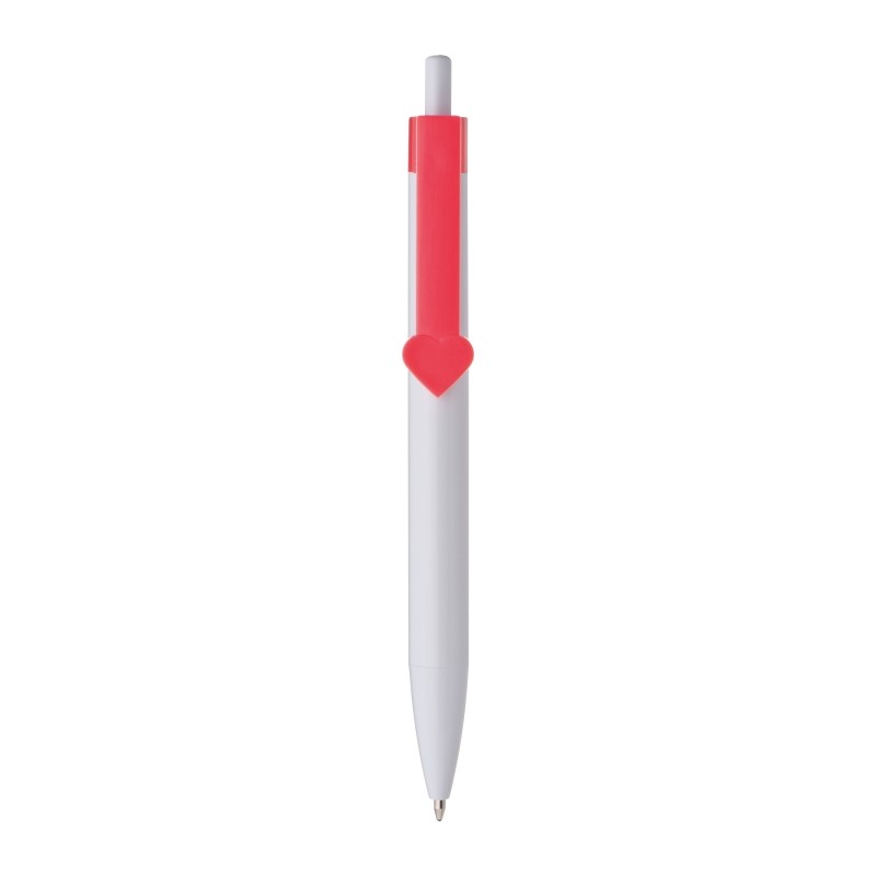 Plastové kuličkové pero s modrou náplní, s bílým tělem a klipem v tvaru červeného srdce. Doporučená technologie tisku: tampontisk T1. Rozměry: 13,8 x 1,8 x 1,6 cm