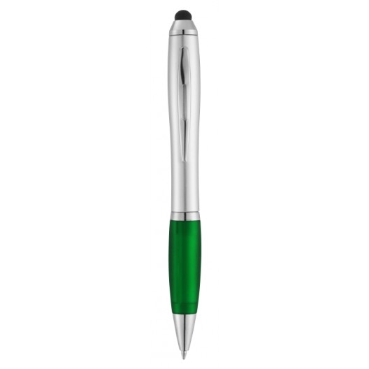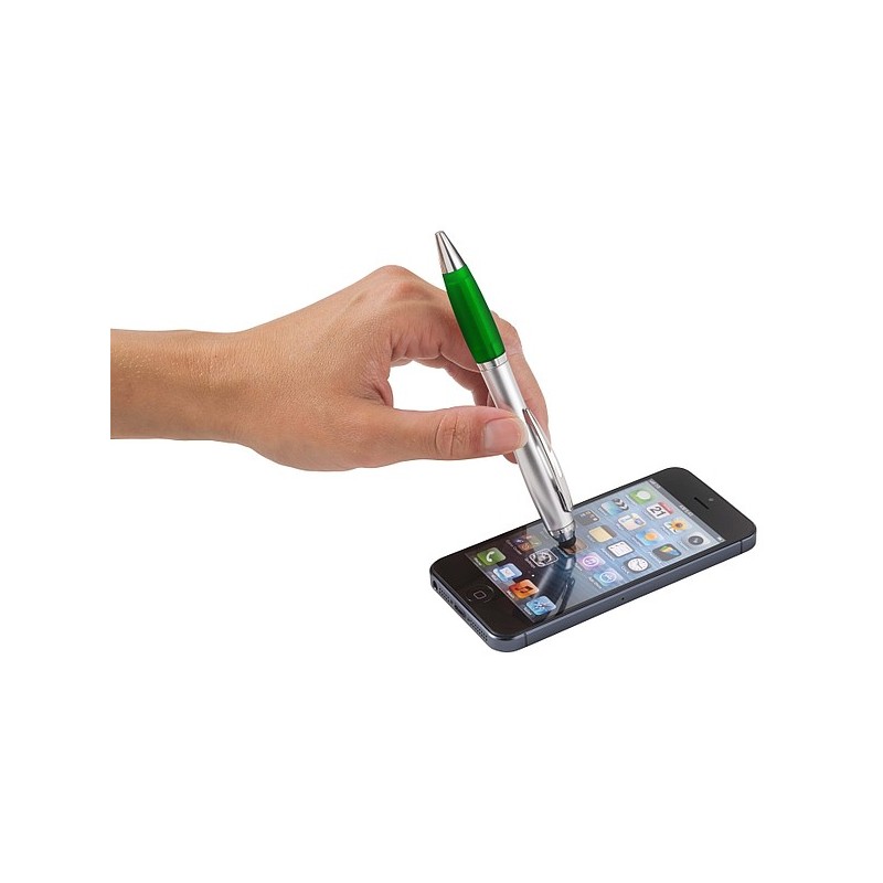 Kuličkové pero se stylusem, stříbrné tělo, náplň černá, zelený úchop