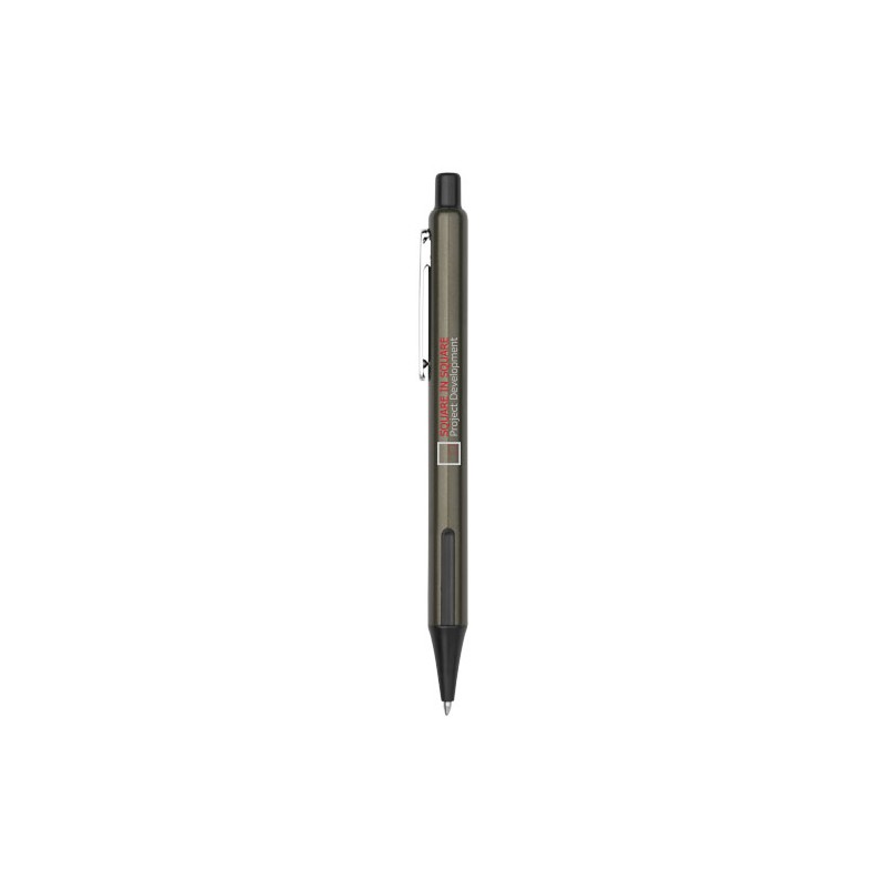 Kuličkové pero Milas s barevným hliníkovým tělem, bočními pryžovými pásky pro lepší úchop a přítlačným mechanismem. Rozměr: 14 x O 1 cm. Doporučená technologie tisku: Laser - L1