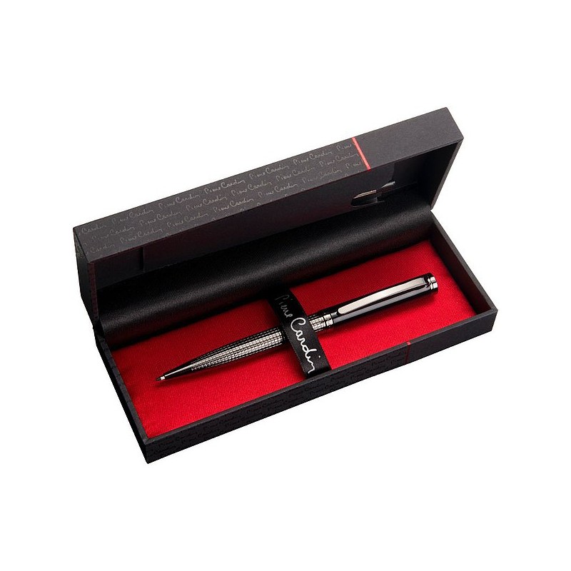 Značkové kuličkové pero v černém provedení. Spodní část jeho těla je zdobena luxusním rytím v gunmetalové barvě. Kuličkové pero má otočný mechanismus, obsahuje kvalitní náplň v modré barvě s hrotem 1 mm a náhradní černou náplň. Baleno v luxusní krabičce Pierre Cardin s přiloženým certifikátem pravosti.