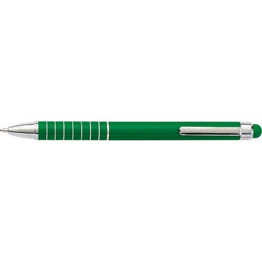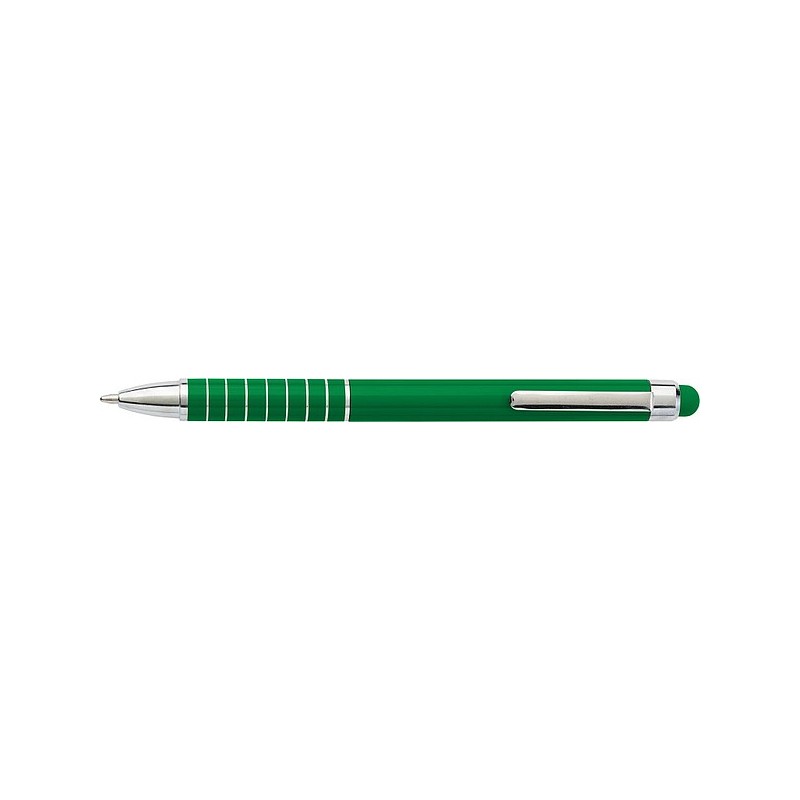 Kovové kuličkové pero s barevným stylusem, modrá náplň. Doporučená technologie tisku: laser L2. Maximální velikost tisku: 40 × 5 mm. Rozměry: o 1,1 × 12,6 cm. Kartonové množství: 500