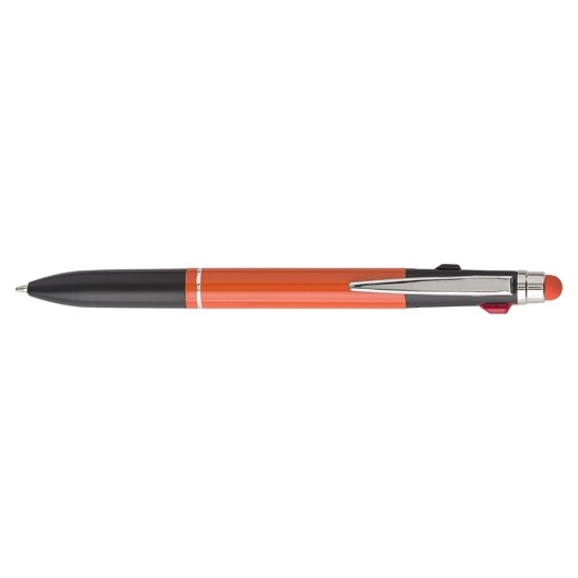 Tříbarevné hliníkové kuličkové pero se stylusem pro kapacitní displeje. Obsahuje modrou , černou a červenou náplň. Má stříbrné detaily. Rozměr: O 1,5 x 14,6 cm. Doporučená technologie tisku: Laser L1