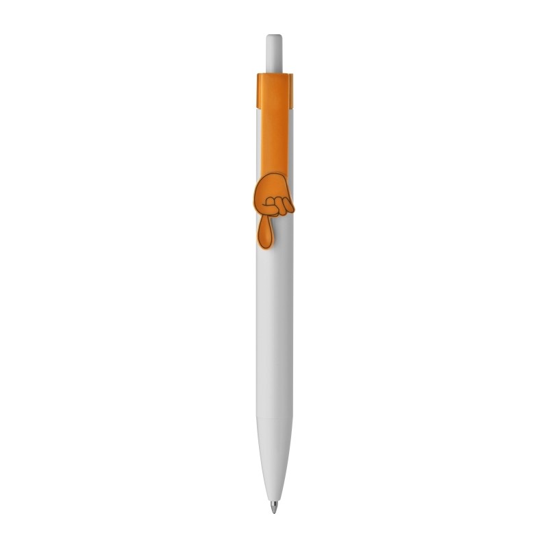 Plastové kuličkové pero s modrou náplní, bílým tělem a klipem s ukazujícím prstem oranžové barvy. Doporučená technologie tisku: tampontisk T1. Rozměry: 13,8 x 1,3 x 1,5 cm